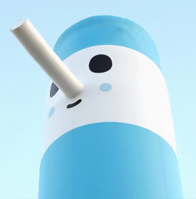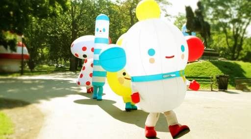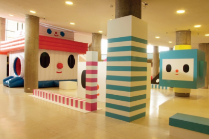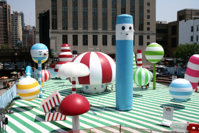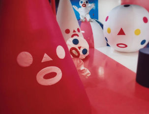 As their reputation grew, FriendsWithYou expanded from small plush talismans to room-sized, and then street-sized, installations. Miami's burgeoning art scene (energized by the launch of Art Basel Miami Beach in 2002) proved the perfect playground for Borkson and Sandoval's ambitions. In 2005, they unveiled “Cloud City” at the Museum of Contemporary Art's warehouse during Art Basel Miami, marking their first major foray into large-scale interactive art. Cloud City was exactly what its name evokes: an adventurous dream world playground assembled from giant geometric forms. Visitors entering the installation found themselves surrounded by oversize inflatable spheres and pillowy cones up to 10 feet tall, some mounted on casters so they could be rolled around with glee. The space was soft, bouncy, and drenched in bright colors. Formally, it felt like stepping inside one of FriendsWithYou's plush toys, enlarged to architectural scale. Simple shapes (the cone, the cylinder, the sphere) dominated the environment, their smooth surfaces inviting touch and interaction, while a few of these shapes bore the unmistakable minimalist face of a FriendsWithYou character: two black dot eyes and a small smiling curve. In fact, one recurring face belonged to a character called The Boy, an archetype the artists described as embodying youth and naïve creation. In Cloud City, The Boy and his geometric friends were not static sculptures but living parts of the story. Visitors could slide down fiberglass slopes, push around enormous foam creatures on wheels, and essentially become childlike players in this cartoonish city.