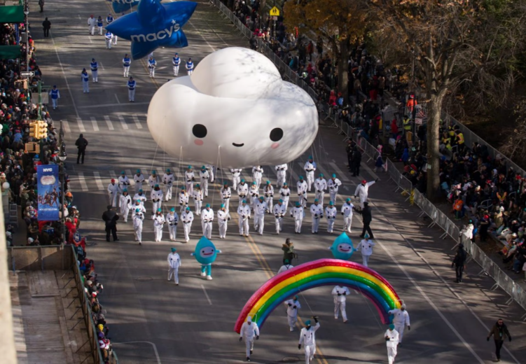 On Thanksgiving morning in 2018, millions of Americans watching TV saw a giant white Little Cloud with a sweet smile floating down 6th Avenue in Manhattan, flanked by two costumed raindrops and a vibrant rainbow arch. This was FriendsWithYou's Little Cloud character making its debut in the storied Macy's Parade, a dream Borkson and Sandoval had harbored since admiring the parade in their youth. The Little Cloud balloon measured 30 feet wide and 22 feet tall, a scaled-up embodiment of a figure that had recurred in the duo's work for years (Little Cloud had appeared in prints, sculptures, even as a phone-case design beloved by Ariana Grande). Now it floated among pop-culture icons like Pikachu and SpongeBob. The parade's producer noted, “Their cloud is very cute and whimsical. And what better balloon to create than a cloud?”. For FriendsWithYou, this moment was the ultimate validation of their approach – they had entered an American cultural tradition historically reserved for big entertainment brands and given it a dose of pure art-meets-spirit. Borkson called the Little Cloud balloon “almost positive propaganda… beyond art for us, it's like world activism and world love.” As they walked below the bobbing cloud that day, hand-in-hand with the rainbow streamer, the artists felt they were quite literally sharing their message with the whole world. And in a sense, they were: an estimated 3.5 million people saw the balloon in person, and over 50 million watched from their screens. The sight of the wide-eyed cloud drifting over skyscrapers was brief, but for many it brought a smile. In the era's charged political climate, FriendsWithYou framed that smile as a small victory against negativity. “We just want to give people hope and some type of relief from our crazy world,” they said, noting that even if they wouldn't label the cloud political, it was certainly “battling the dark forces” by offering an alternative vision of kindness.