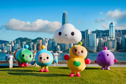 FriendsWithYou's characters come to life against the Hong Kong skyline, September 2021. Little Cloud (center) and friends like Jelly (left) and Hug Bug (right) spread their message of joy in the West Kowloon Art Park. (Photo: Business Wire)
