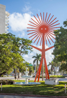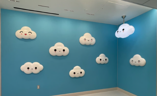 Back home in the U.S., Borkson and Sandoval also deepened their engagement with healing environments and public art. A significant milestone was the 2023 opening of “Little Cloud Dream,” a permanent installation in the lobby of the Guerin Children's pediatric unit at Cedars-Sinai Hospital in Los Angeles. In this work, a cluster of gently glowing Little Cloud sculptures hover overhead in a calming sky-blue room, creating a soothing atmosphere for sick children and their families. The piece functions as a therapeutic distraction, a night-light of optimism in a medical setting. It is a direct realization of FriendsWithYou's original promise to “help the everyday person cope”– here, easing the anxiety of hospital visits by offering something soft, bright, and reassuring to look at. Doctors at Cedars-Sinai noted the positive impact such art can have on pediatric care, aligning with research that art and play reduce stress in healing processes. For FriendsWithYou, this was a full-circle moment: their once humble toy-like creations had become literal beacons of hope in a place of need. Similarly, in Miami Beach in 2022, they installed “Starchild,” a permanent public sculpture commissioned by the city. Starchild is a massive abstract star form with two eyes, painted in orange – a new guardian for Miami's residents and visitors, spreading the gospel of unity in the very city where FriendsWithYou was born two decades prior. Such works signal that even as the duo conquers cyberspace and media, they remain committed to the physical communal spaces – city parks, hospitals – where human connection is most directly felt.