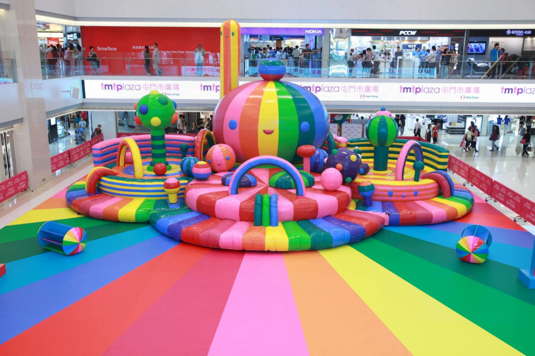 Other projects around this time cemented FriendsWithYou's international reach. In the summer of 2012, Hong Kong's Tuen Mun Town Plaza was host to “Happy Rainbow,” a 16-piece inflatable bounce-house installation that echoed Rainbow City's motifs. Happy Rainbow was fashioned as a modern shrine of joy. A “colorful interactive bounce house” integrated with fiberglass sculptures and translucent resin pieces. At 40 feet tall, it quite literally enveloped visitors in a multicolored glow, which the artists intended to “transcend them into a higher state of self-awareness.”. Even in bustling Hong Kong, thousands came to experience this pop-up sanctuary of play. The installation was described as being “charged with so much color and power that it brings great harmony to all who look upon it,” and local press noted how it blended elements of Eastern spiritual iconography with the universal language of fun. By now, comparisons were often drawn between FriendsWithYou and leading figures of contemporary art who also use bold colors and repetition to transformative effect. Critics called Borkson and Sandoval “progenies of Takashi Murakami and Yayoi Kusama,” acknowledging how, like Murakami, they employ a “superflat” pop aesthetic, and like Kusama, they create enveloping environments of polka-dots and smiles. Indeed, in Rainbow City and Happy Rainbow, one could see Murakami's influence in the slick, graphic simplification of forms and the blur between high art and pop culture. Likewise, Kusama's legacy was felt in the way these installations offered a serene surrender to color and pattern – though instead of Kusama's infinite polka dots aiming for cosmic oneness, FriendsWithYou offered squishy clouds and rainbow roads aiming for childlike giddiness.