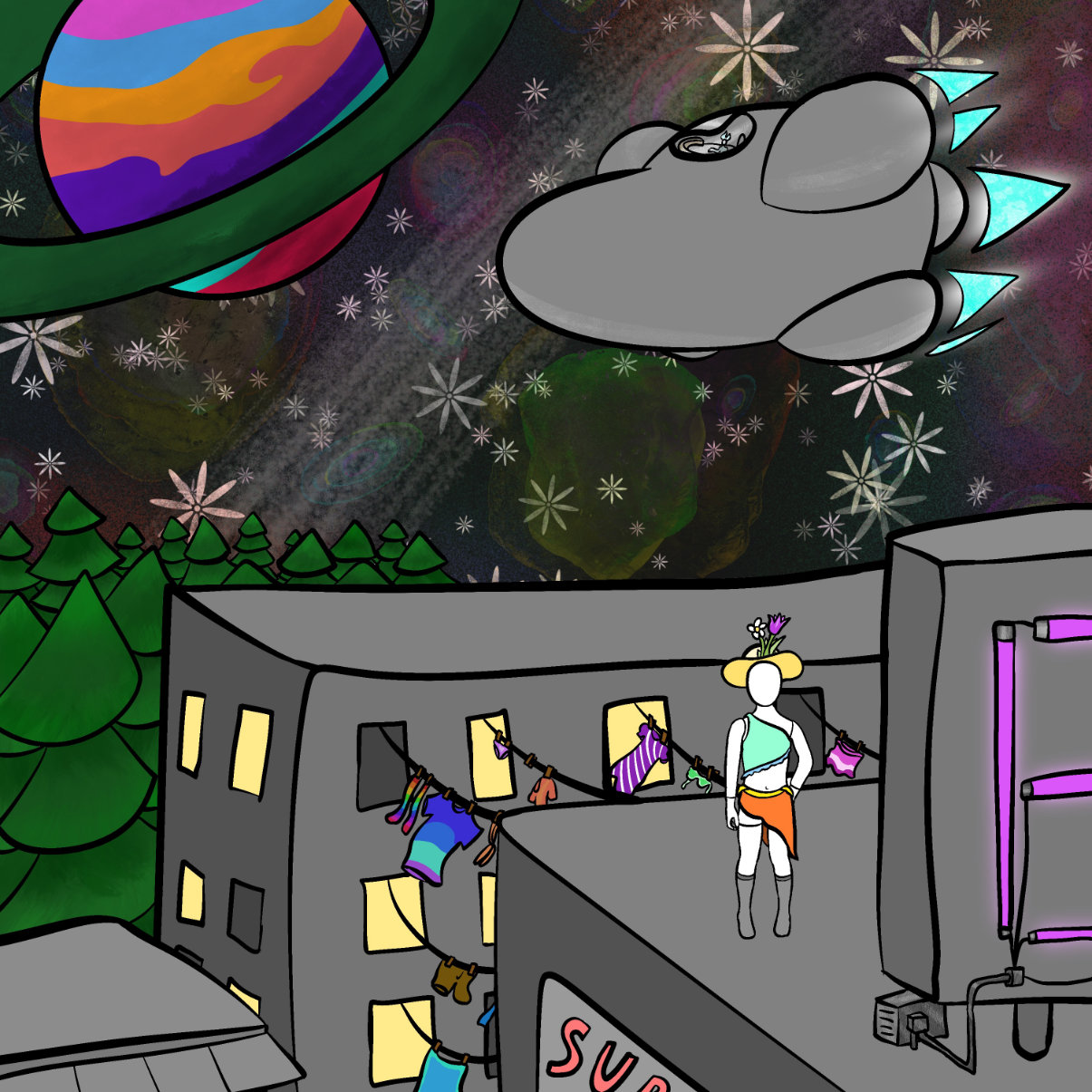 As Cron and Annequin travel from world to world, Annequin befriends locals, partakes in their daily lives, and earns their trust. A detail that I particularly love is that Annequin accumulates garments given to her by the many peoples she encounters, each piece symbolizing a bond, memory, or meaningful connection. This mirrors my real-world hobby of sewing clothes for mannequins and nods to their core function: to wear what we create. Her wardrobe becomes a rich patchwork of memories from diverse cultures and eras, each garment handmade by someone who cared for her.