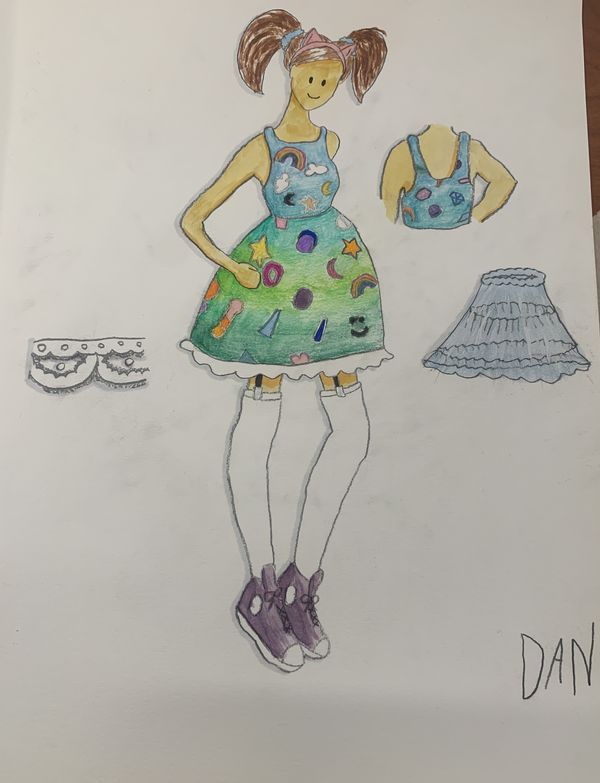 One of my classes this semester is costume design, where I created a watercolor drawing of my dream outfit (see photo). I’m hoping to make this outfit a reality one day and bring my vision to life.